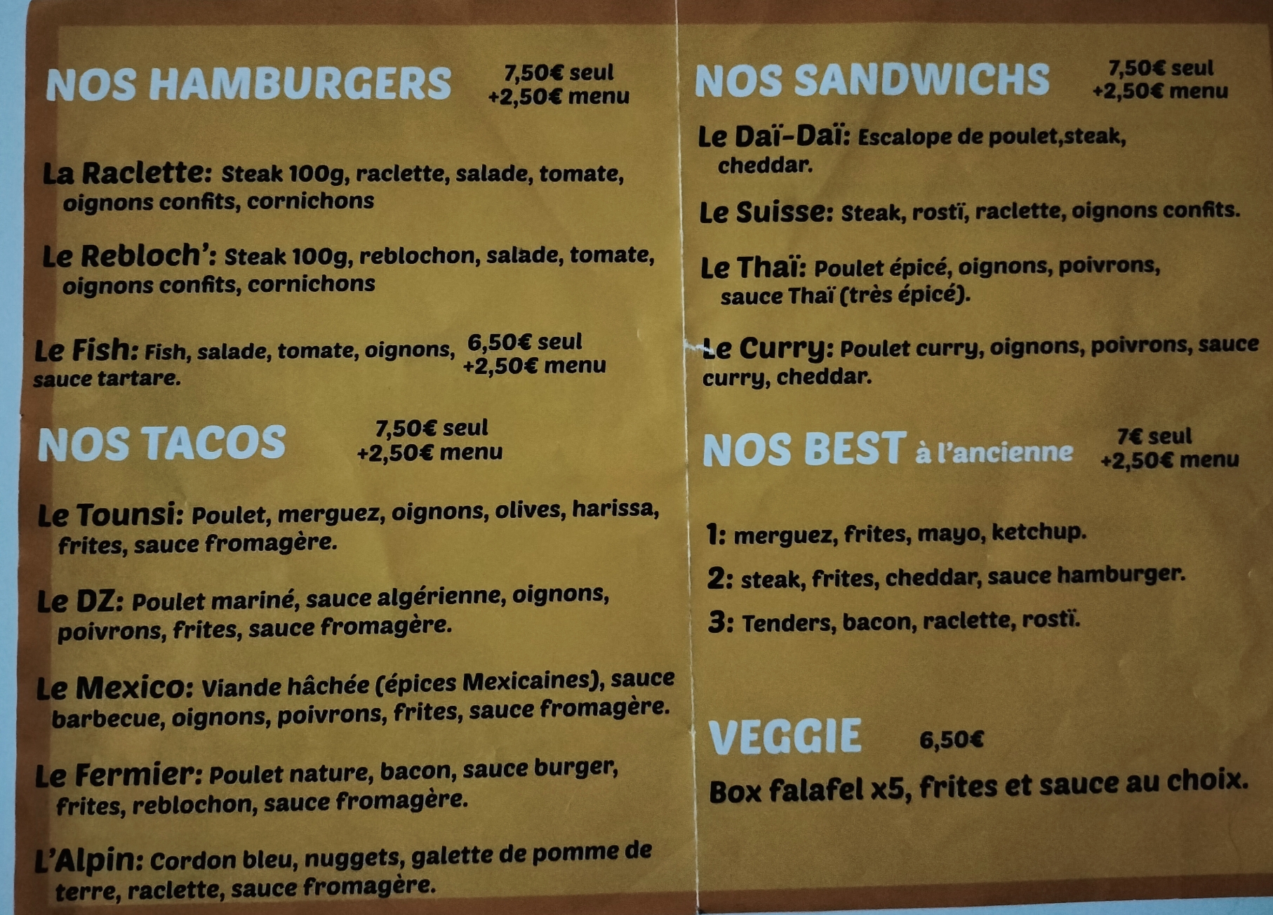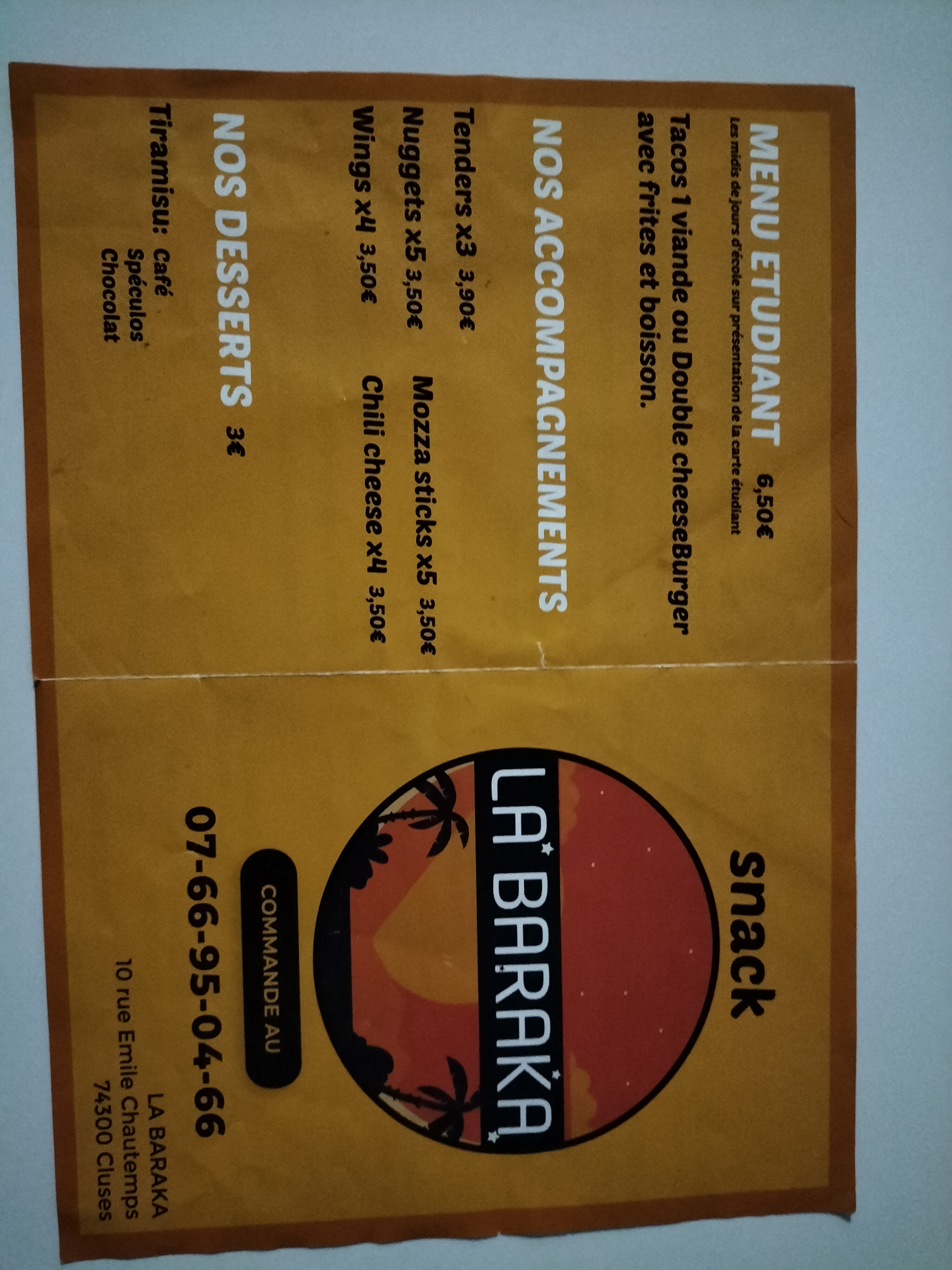 Bienvenue au restaurant LA BARAKA situé dans la belle ville de CLUSES. Nous avons hâte de vous accueillir ! Nous sommes là pour vous servir le meilleur. Notre chef prépare une cuisine saine et maison primée. Nos savoureux burgers, sandwichs, frites et tacos vous attendent ! Venez déguster nos plats entre amis ou en famille. Les plus gourmands apprécieront notre délicieux tiramisu. Nous nous adaptons à vos préférences alimentaires en proposant une gamme d'options halal et végétariennes. Savourez un délicieux café dans notre cadre confortable. Profitez pleinement de votre expérience dans notre établissement grâce à des installations telles qu'un parking et une connexion Wi-Fi gratuite. L'accès est facile pour le confort de tous nos clients. Les animaux de compagnie sont les bienvenus. Un espace fumeur est à votre disposition. Plusieurs options de paiement sont disponibles.